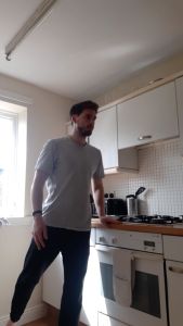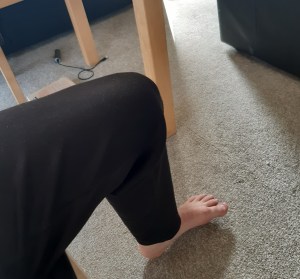 - Stood two feet away, facing the kitchen counter or dining table, hands on for support.