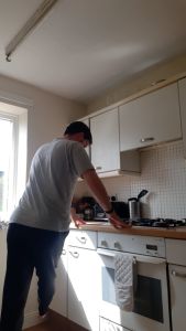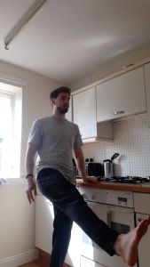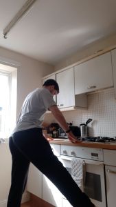 - Turn parallel to counter and swing your leg backwards and forwards.